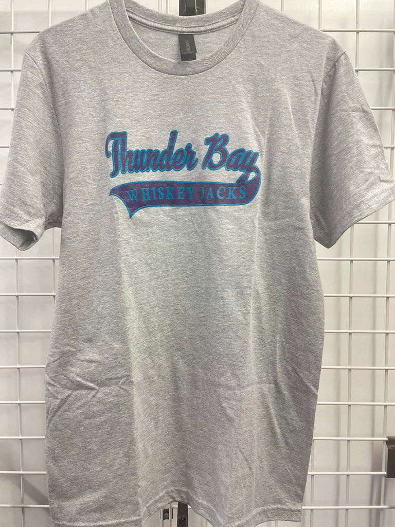 Vintage retro style brand new softstyle sport grey t-shirt with screen printed teal blue and purple script logo.