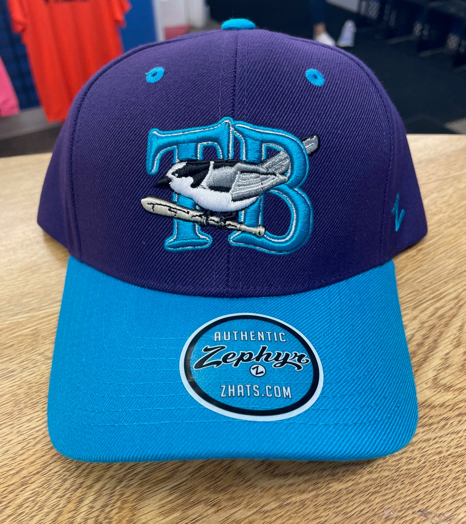 Adjustable official Zephyr Zhat. Purple with Teal brim. Enclosure is Snap Back. Brim is curved. Canada flag stitched on back above enclosure.